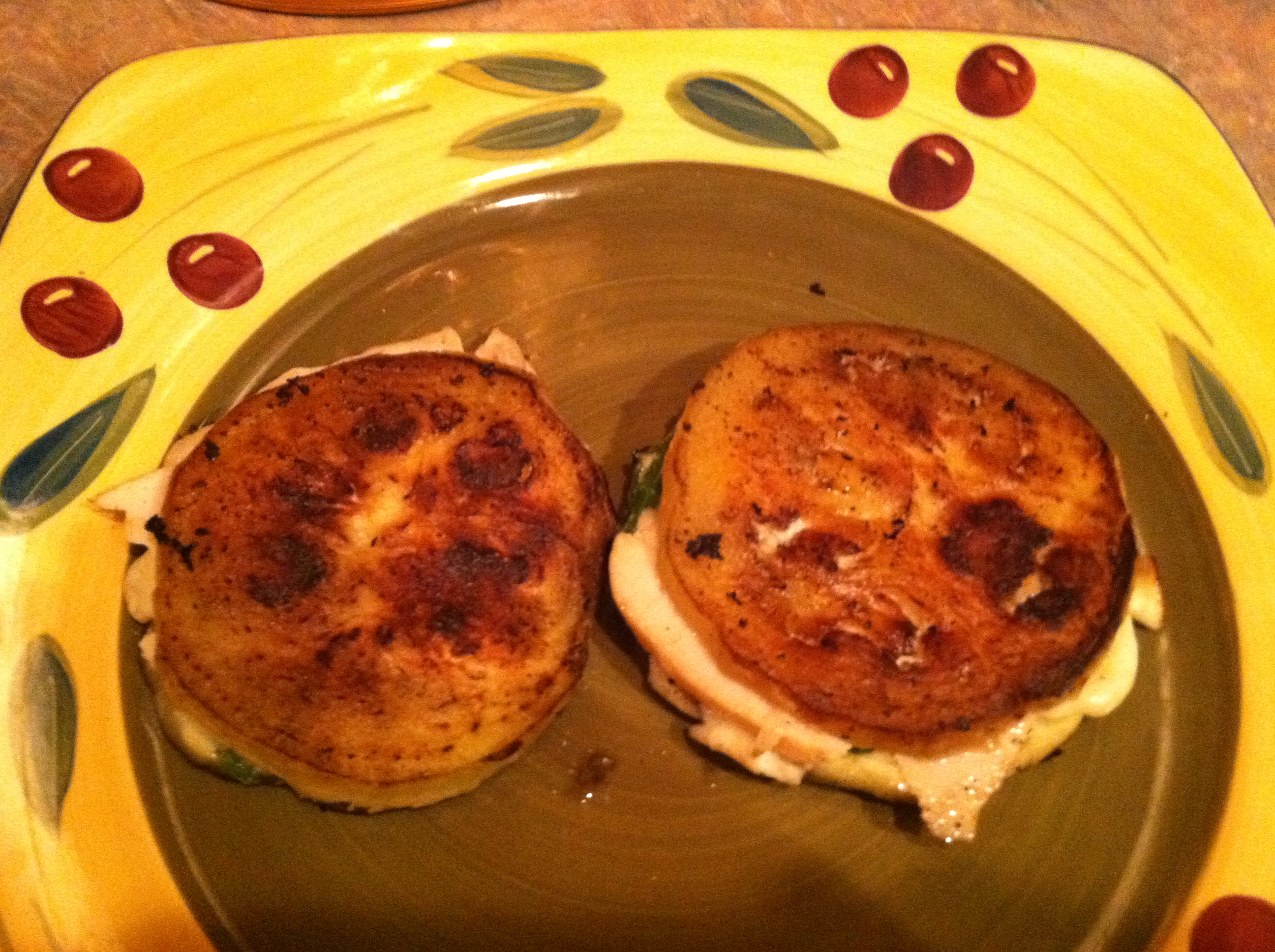 Peel the eggplant and slice into quarter inch discs. Select two even ones and put them on a plate. Lightly salt and pepper both sides. Get out the Boursin and spread a thin layer on one of the slices. Put the turkey, spinach, onion and mozzarella on in whatever order you want, as long as it doesn’t fall apart, then place the second eggplant slice on top of it all. If you don’t have better quality mozzarella, string cheese strips work just fine. Drizzle some olive oil on your pan or griddle and let it heat for a little bit. Carefully place the eggplant sandwich on the pan/griddle. Wait until that side is well browned, then flip, supporting the top as you do. wait until that side is browned, scoop onto a plate and eat with a fork (it falls apart if you use your fingers, but if you want to be brave, go ahead).