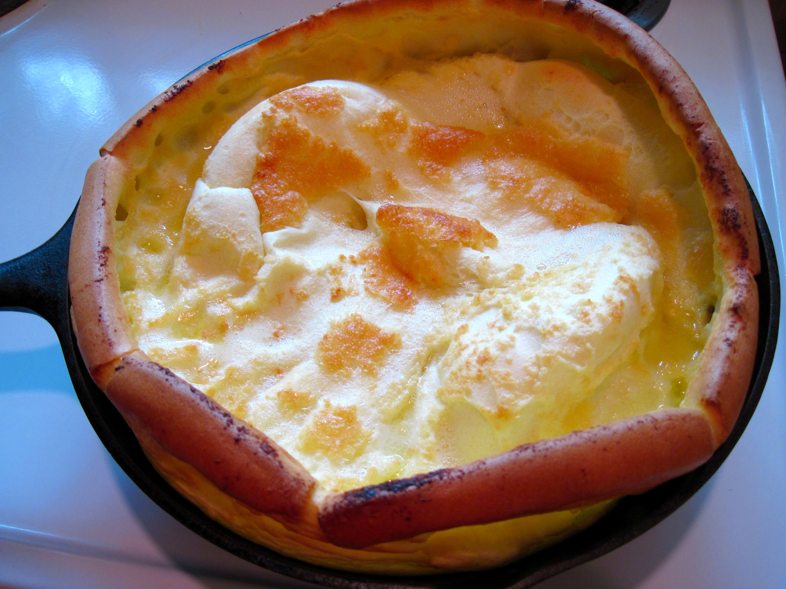 Whisk until smooth in a medium sized bowl. Put 1/2 cup (1 cube) of butter in a square 8″ by 8″ pan, or a pie pan and put pan in oven until butter is melted and bubbly. Take pan out, pour in batter and put back in oven for 20-25 min, or until golden and puffed up.