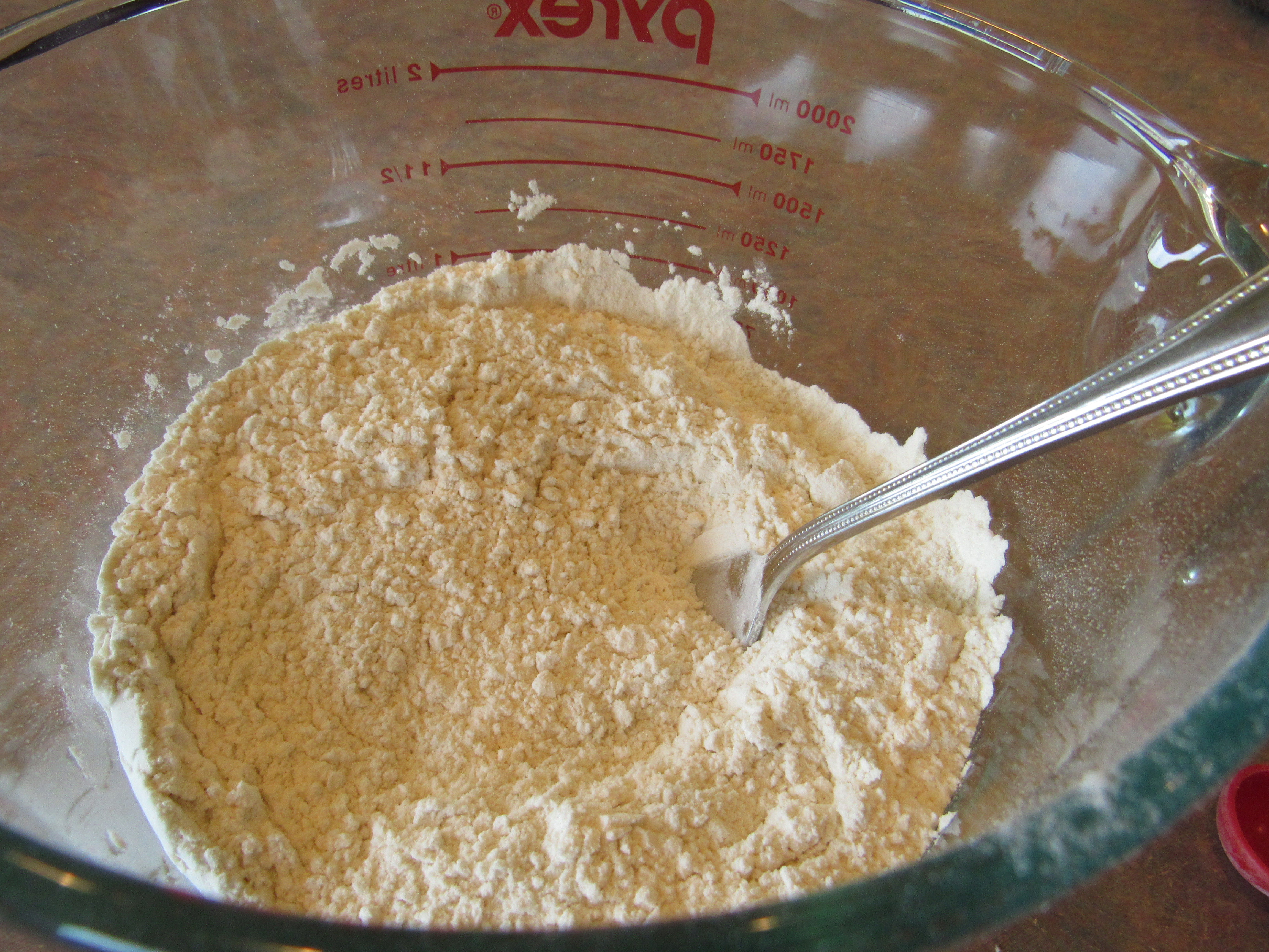 2. While the mixer is running, measure the flour into your medium mixing bowl, than add the soda and salt. Stir together using your teaspoon (or a fork. Okay, I cheated. But it was sitting right there….)