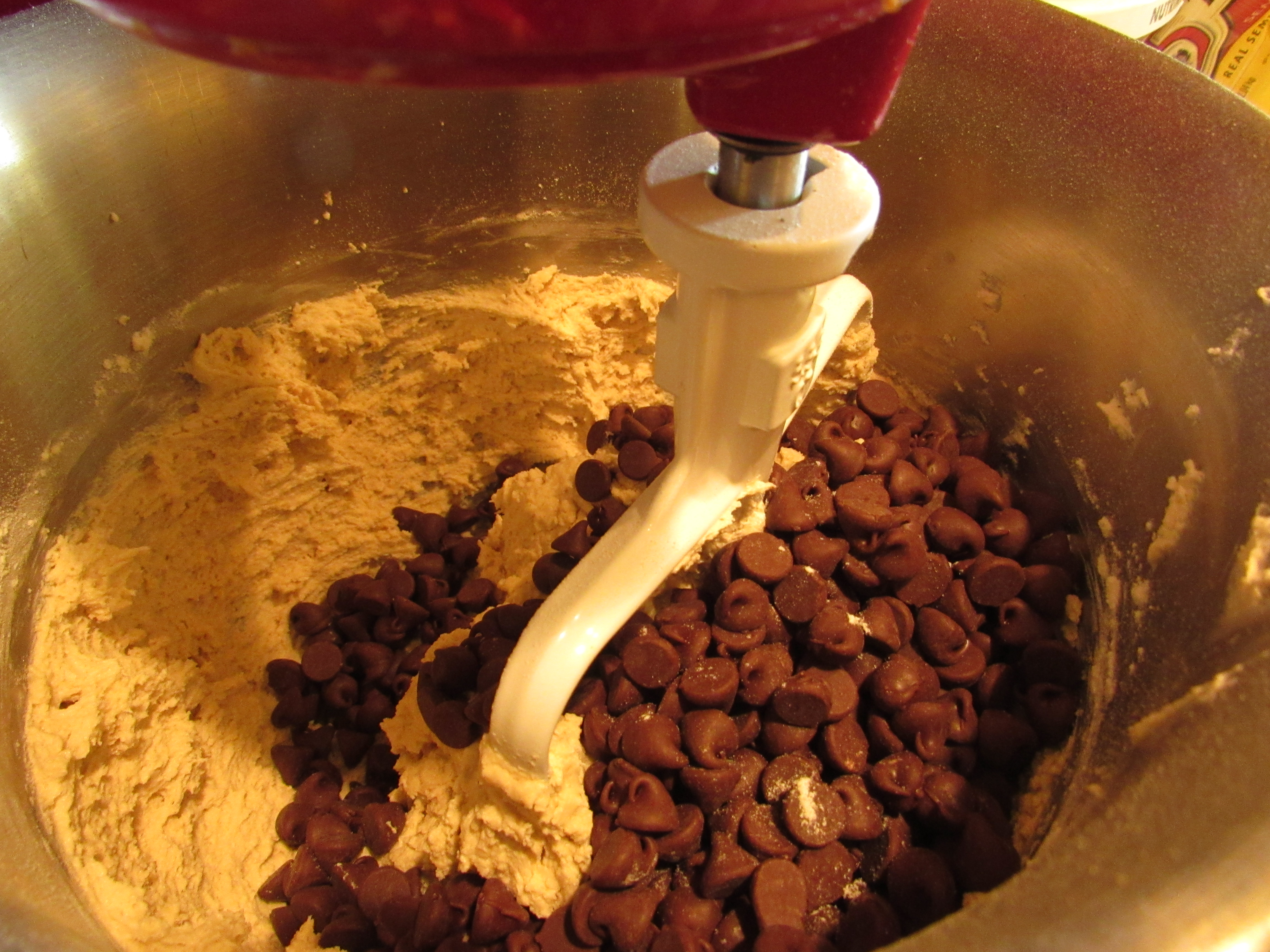 6. When the dough is mixed, add the chocolate chips (and pecans if you want them.) Mix until combined.