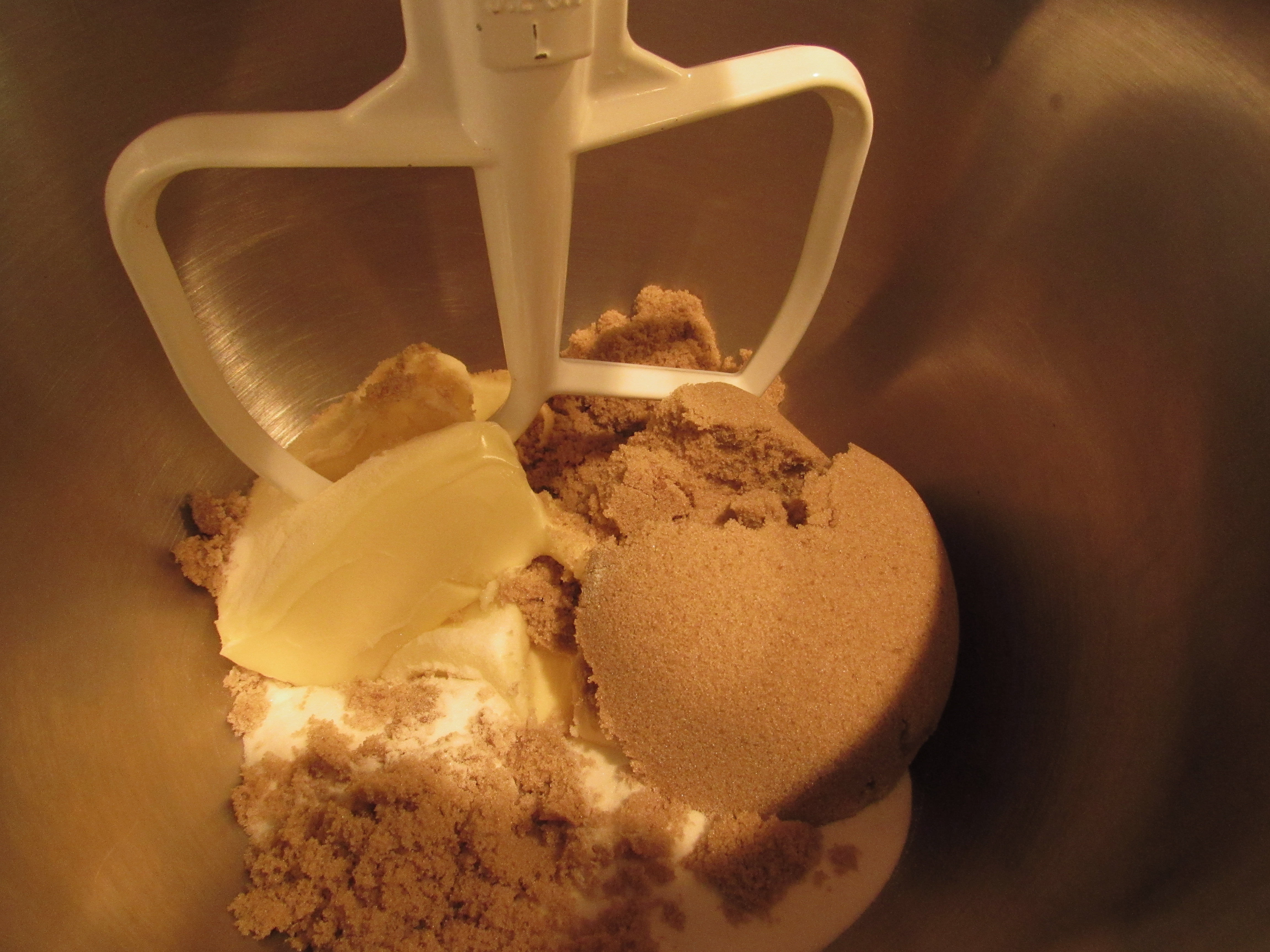 1. Put butter into mixing bowl with the sugars. Start the mixer. Wait till it’s mixed just enough that it won’t splatter on high, then turn it up to high.