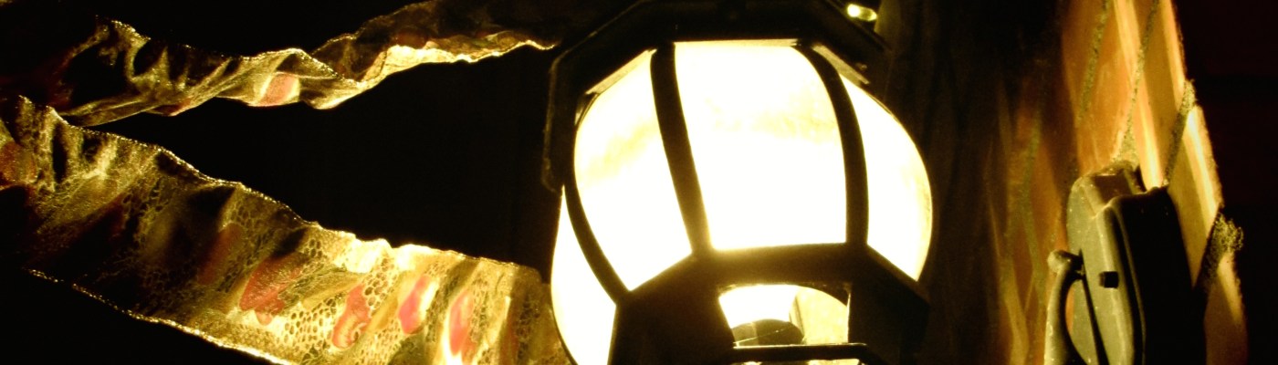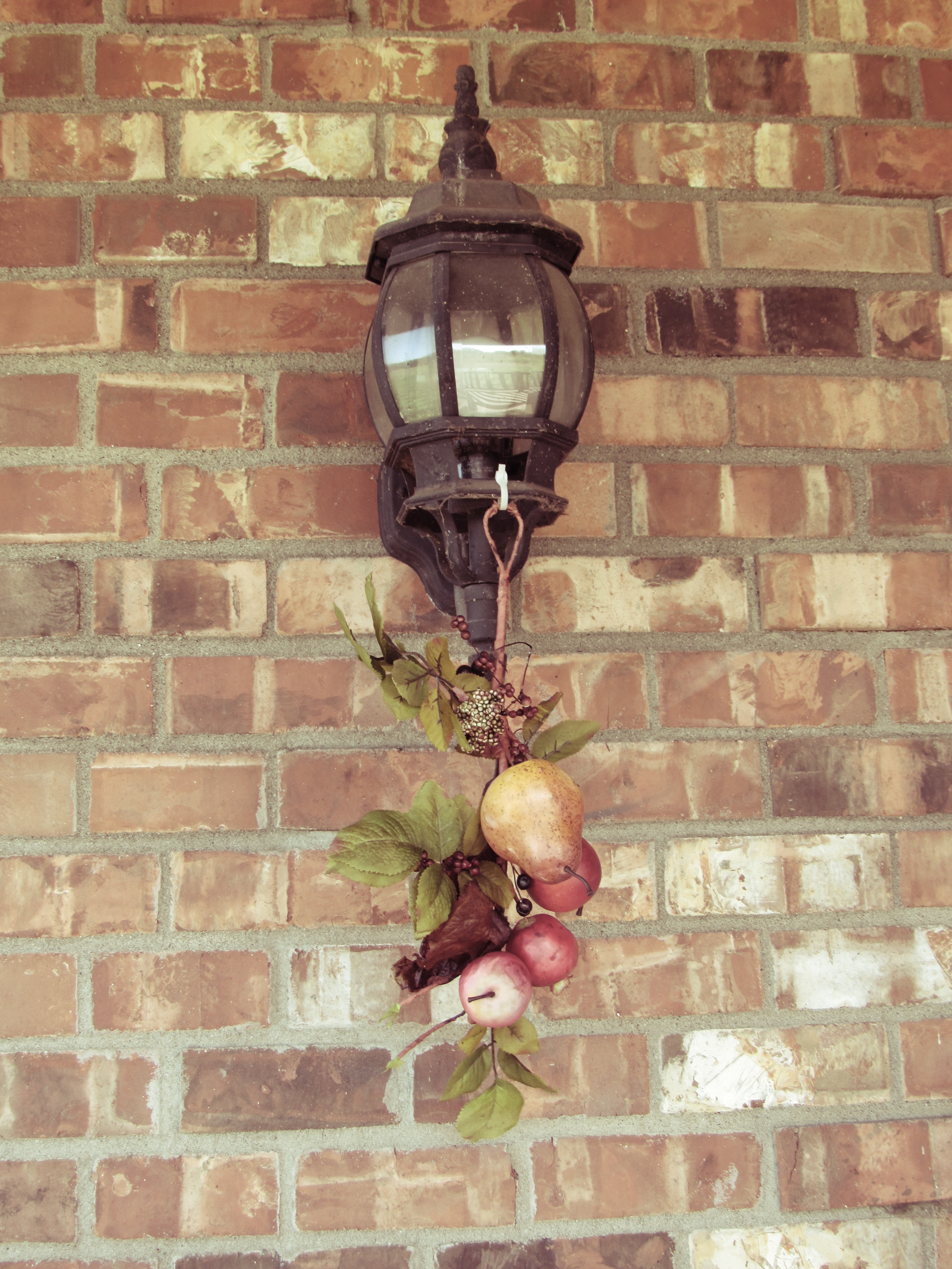 A little fake-fruit bunch on the porch light.